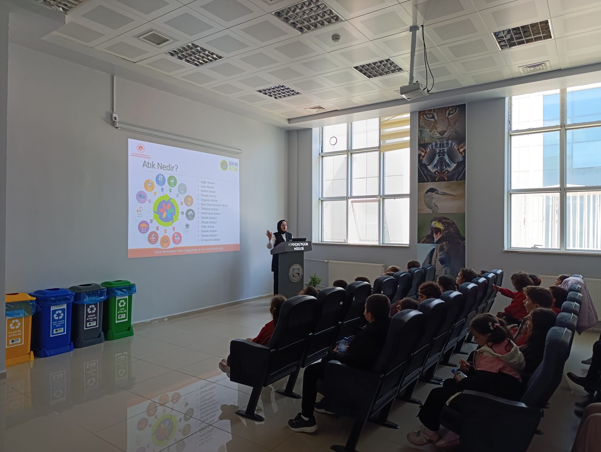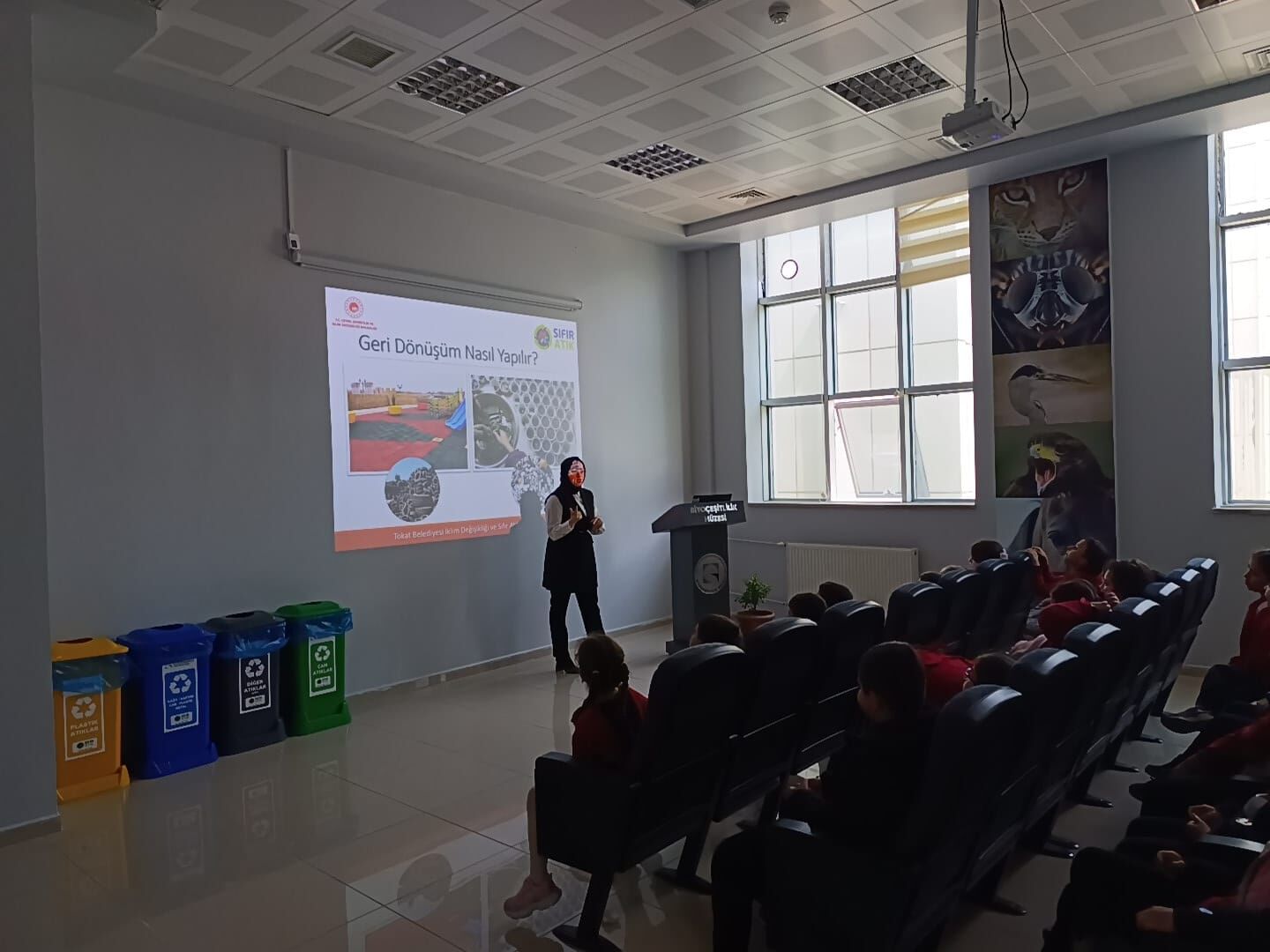 Tokat Belediyesi Sıfır Atık Müdürlüğü bünyesinde görev yapan Çevre Mühendisi Esma Çiftçi, teorik bilgilerin pratiğe döküldüğü çalışmalardan bahsetti. Öğrencilere atık yönetimi ve geri dönüşüm süreçlerini anlatan eğitici bir sunum yaptı. Biyoçeşitlilik Müzesi konferans salonunda Tokat Belediyesi adına eğitimin yanı sıra öğrencilere sıfır atık bilincini yaymak adına file çanta ve atık pil kutusu hediyeleri verildi.
