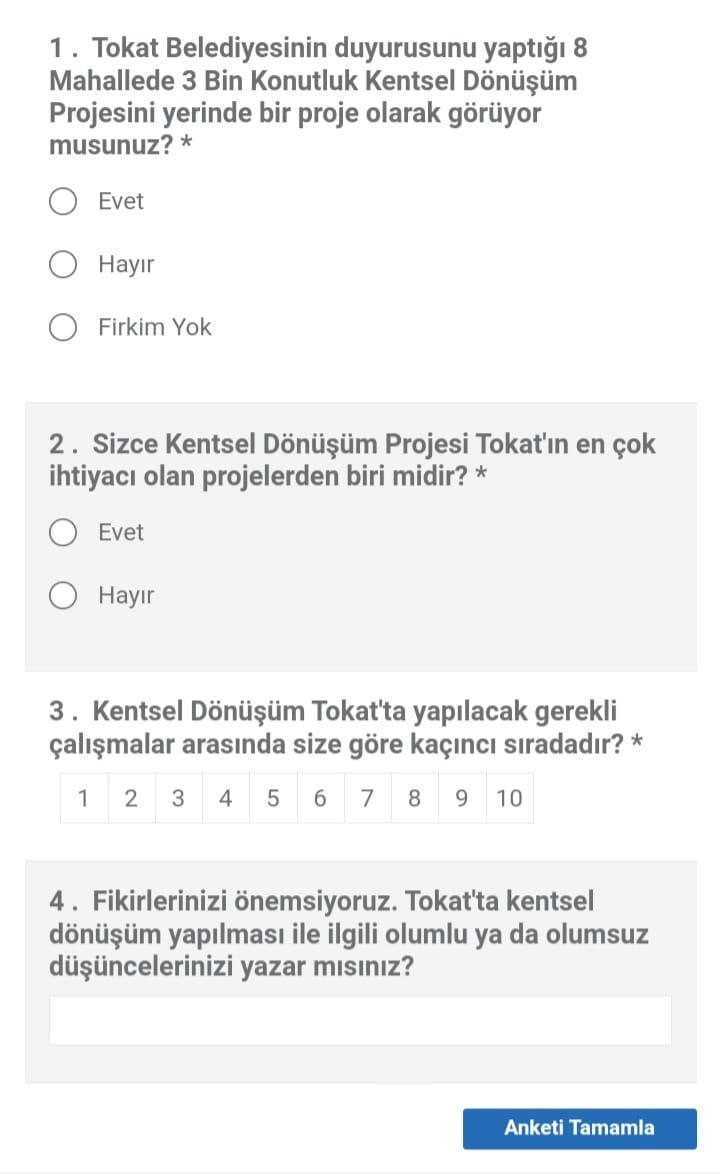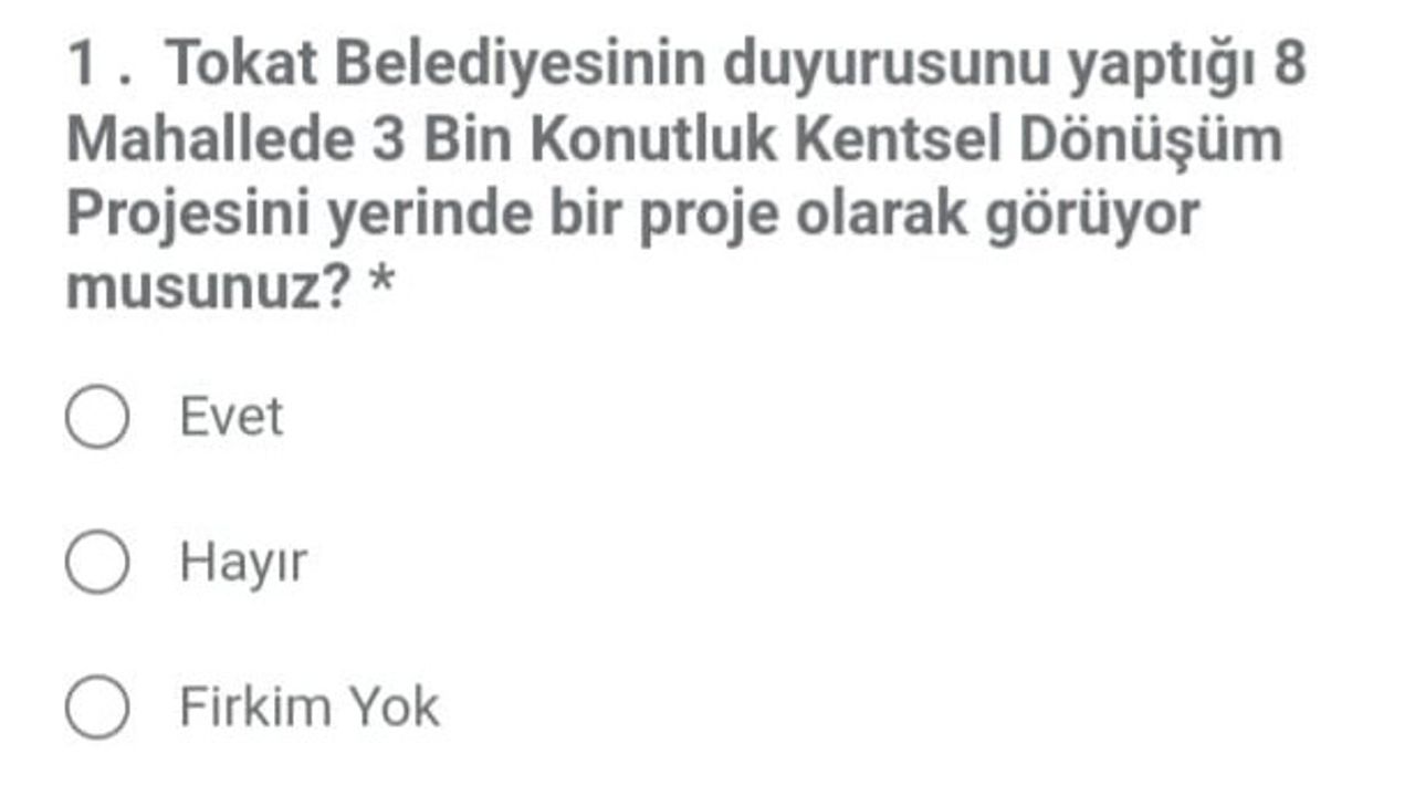 Tokat Belediyesinin kentsel dönüşüm için yaptığı anketteki dört soru şöyle: