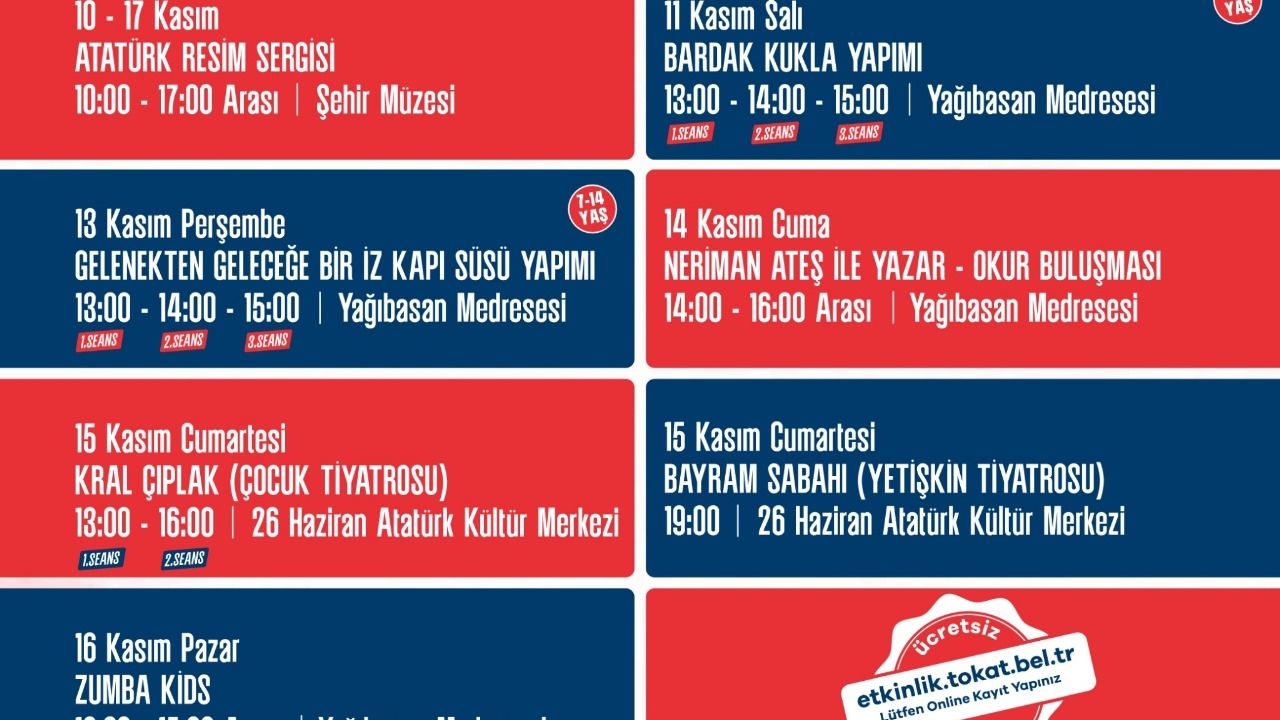 Tüm etkinlikler ücretsiz olarak gerçekleştirilecek. 8, 11 ve 13 Kasım'daki atölyelere katılmak isteyenlerin, etkinlik.tokat.bel.tr adresi üzerinden online kayıt yaptırması gerekiyor.