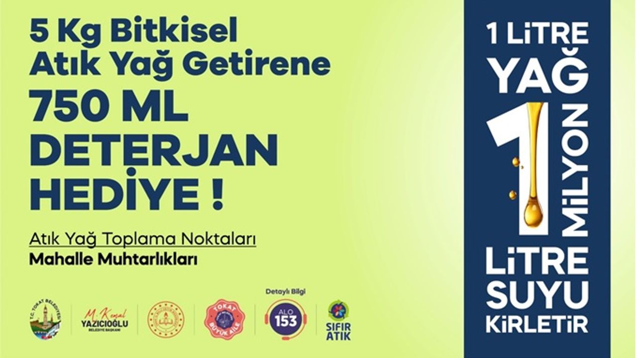“Tokat Belediyesi olarak sıfır atık projesi kapsamında evsel kaynaklı bitkisel atık yağların çöpe, lavaboya veya toprağa dökülerek çevre kirliliği oluşturmasını önlemek için çevre lisanslı bitkisel atık yağ toplama firması ile imzalanan işbirliği protokolü kapsamında çalışma yapılmaktadır. Sıfır Atık projesine vatandaşlarımızı da dahil edebilmek için Tokat Belediyesi önemli çalışmalara imza atabilmek adına çeşitli kampanyalar yürütmektedir. Bunlardan biri evsel kaynaklı bitkisel atık yağların ayrı toplanması ve bu konuda farkındalık oluşması amacıyla Belediye Başkanımız sayın M. Kemal YAZICIOĞLU beyefendinin de desteğiyle Tokat Belediyesi İklim Değişikliği ve Sıfır Atık Müdürlüğü yetkililerince “5 lt Bitkisel Atık Yağ Getirene 750 ml’lik Deterjan Hediye Kampanyası’’ faaliyeti yürütülmektedir. Kampanyaya katılmak isteyen vatandaşlarımız atık yağlarını muhtarlıklara bırakabilir ya da belediyenin Büyük Aile Beyaz Masa 153 hattını arayarak kampanyaya katılmak istediklerine dair talepte bulunabilirler. Böylece belediyemizce atıklar alınmakta ve hediyeler vatandaşlarımıza ulaştırılmaktadır.