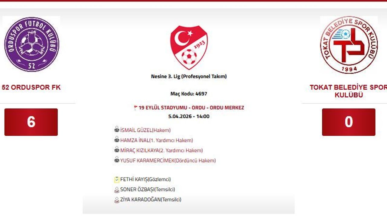 Nesine 3. Lig 2025-2026 sezonunun bitimine iki hafta kala Tokat Belediyespor, deplasmanda aldığı ağır yenilgiyle taraftarını üzdü. Play-Off hattında 2. sırada bulunan 52 Orduspor Futbol Kulübü karşısında varlık gösteremeyen bordo-beyazlı ekip, sahadan 6-0 gibi farklı bir skorla mağlup ayrıldı.