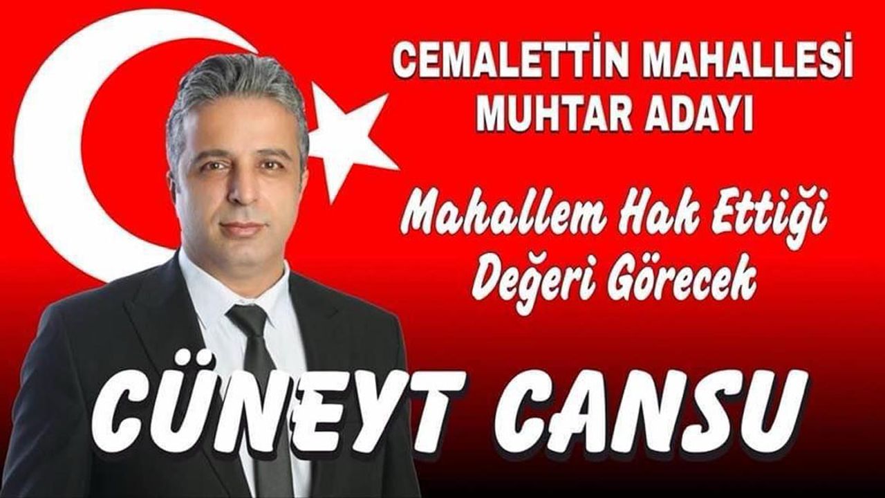 45 yaşındaki Cüneyt Cansu, ilk kez Muhtarlık için adaylığını ilan etti. Cemalettin Mahallesi’nin muhtarlığına seçilmesi halinde yapacaklarını anlatırken spor kulübü kurmayı, mahalle konağı kazandırmayı, ihtiyar heyeti oluşumunu, sokak sağlıklaştırma faaliyetlerini öne çıkardı. Ve muhtarlık maaşını ihtiyaç sahibi ailelere bağışlayacağının sözünü verdi.