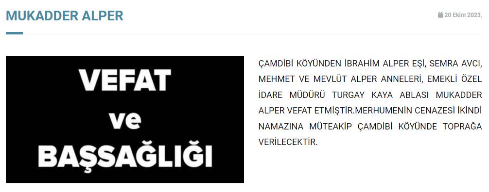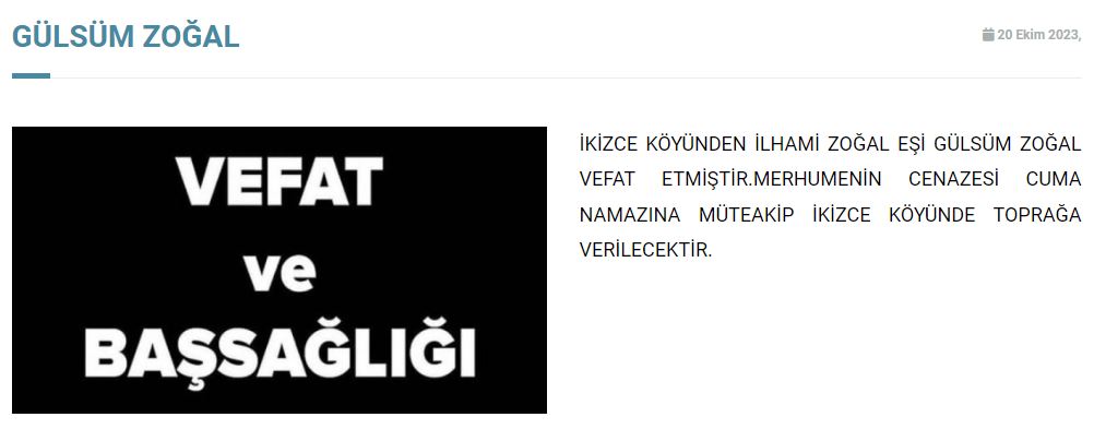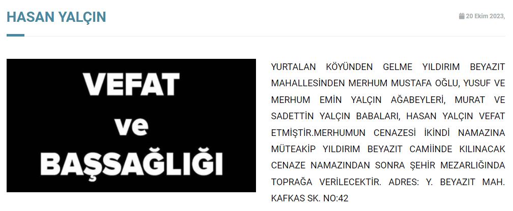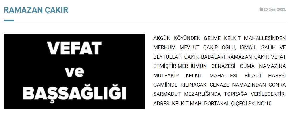 Bugün kullanıcılar 'Tokat'ta kimler vefat etti? Tokat'ta vefat edenler? Erbaa'da vefat edenler? Turhal'da vefat edenler?' sorularını merak ederek internette arama yapıyor. İşte Tokat ve ilçelerinde vefat eden vatandaşlarımızın isimleri yakınları ve defin yerleri ile saatlerini ait bilgiler;