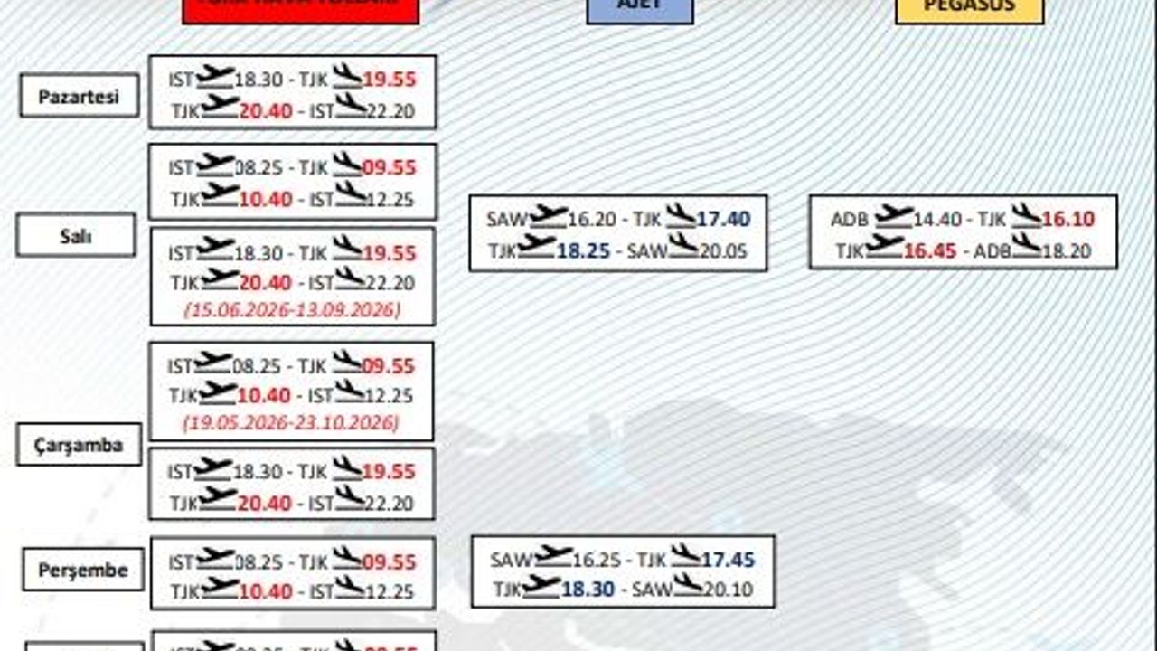 * Salı günleri İstanbul Havalimanından saat 08.25’te havalanacak, saat 09.55’te Tokat’a iniş yapacak. Saat 10.40’ta Tokat’tan kalkacak, Saat 12.25’te İstanbul Havalimanına iniş yapacak. Salı günleri, 15 Haziran 2026 ile 13 Eylül 2026 tarihleri arasında İstanbul’dan saat 18.30’da kalkacak, saat 19.55’te Tokat’a iniş olacak. Tokat’tan 20.40’da kalkıp saat 22.20’de İstanbul’a iniş yapacak seferler olacak.