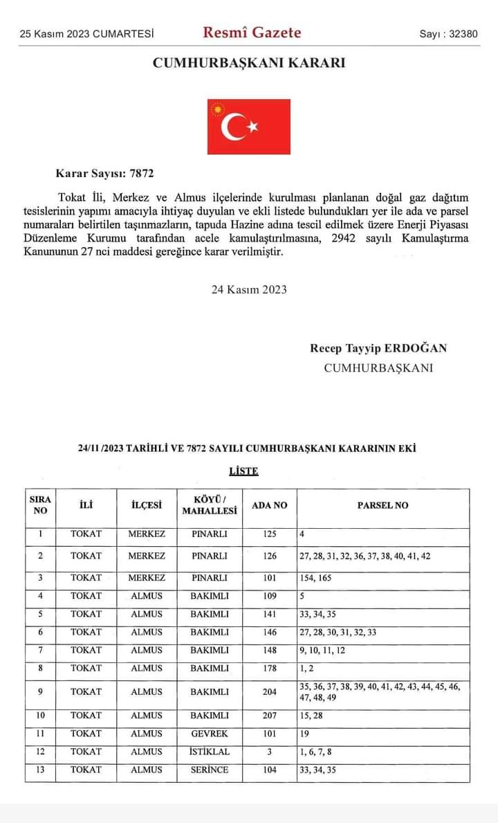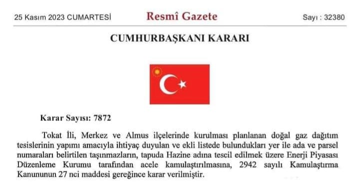 Tokat'ta planlanan doğalgaz dağıtım tesisleri için acele kamulaştırma kararı Cumhurbaşkanı Recep Tayyip Erdoğan'ın imzası ile Resmi Gazete'de yayınlandı.