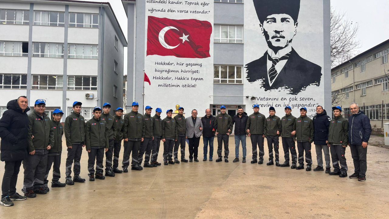 Staj yolculuğu öncesinde okulda düzenlenen özel bir etkinlikle, öğrencilere staj süresince kullanacakları iş sağlığı ve güvenliği (İSG) ekipmanları teslim edildi. Yeni iş kıyafetlerini giyen öğrenciler, öğretmenleriyle birlikte hatıra fotoğrafı çektirerek program için hazır olduklarının mesajını verdiler.