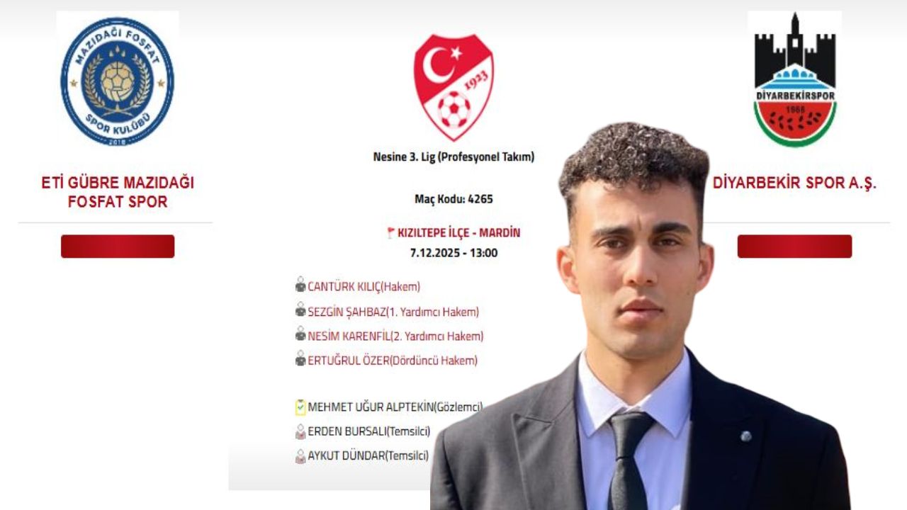 Nesine 3. Lig 2. Grupta 12. hafta müsabakaları kapsamında ETİ GÜBRE Mazıdağı Fosfatspor ile Diyarbekirspor A.Ş., 7 Aralık Pazar günü saat 13.00’da karşı karşıya gelecek. Mücadeleye büyük bir heyecan beklenirken, Türkiye Futbol Federasyonu Merkez Hakem Kurulu (MHK) karşılaşmayı yönetecek hakem ekibini açıkladı.