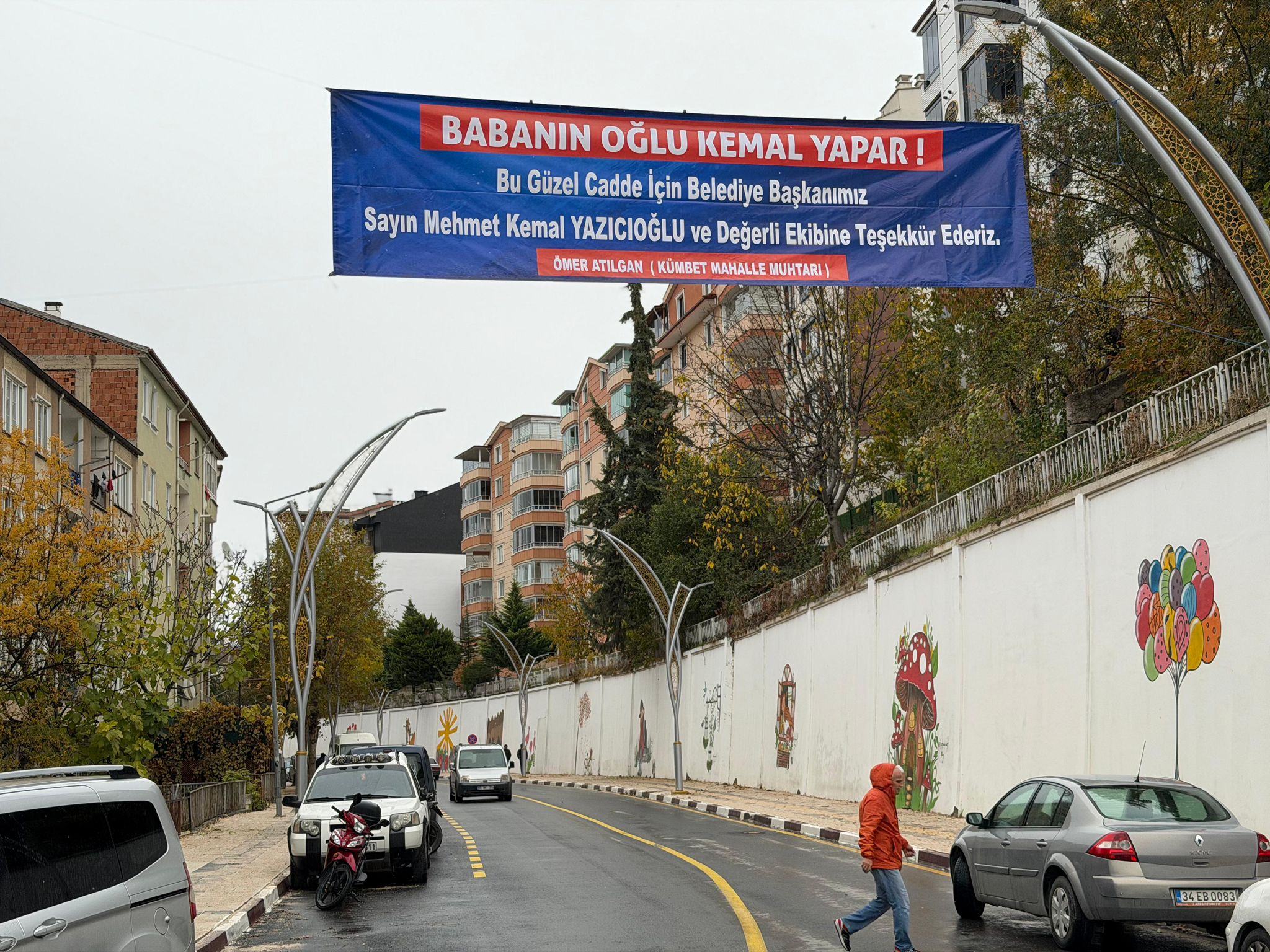 Tokat Belediyesi’nin Kümbet Mahallesi’ndeki çevre düzenleme ve yol asfaltlama çalışmaları tamamlandı. Muhtar Ömer Atılgan, belediye çalışmalarının tamamlanmasının ardından mahallesindeki caddeye astırdığı pankart ile Belediye Başkanı Mehmet Kemal Yazıcıoğlu’na teşekkürlerini bildirdi.