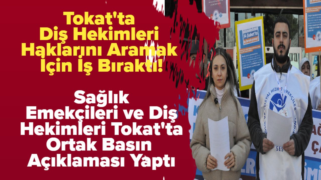 Tokat'ta Sağlık ve Sosyal Hizmet Emekçileri Sendikası (SES) ile Hekim Birliği Sağlık ve Sosyal Hizmetler Çalışanları Sendikası (Hekim Birliği), üyelerinin katılımıyla Tokat Ağız ve Diş Sağlığı Merkezi önünde ortak bir basın açıklaması düzenledi. Açıklamayı, Sağlık Emekçileri Sendikası İşyeri Temsilcisi Furkan Aydın ve Hekim Birliği Sendikası Diş Hekimi Gizem Eroğlu gerçekleştirdi."Haklarımız İçin İş Bırakıyoruz"