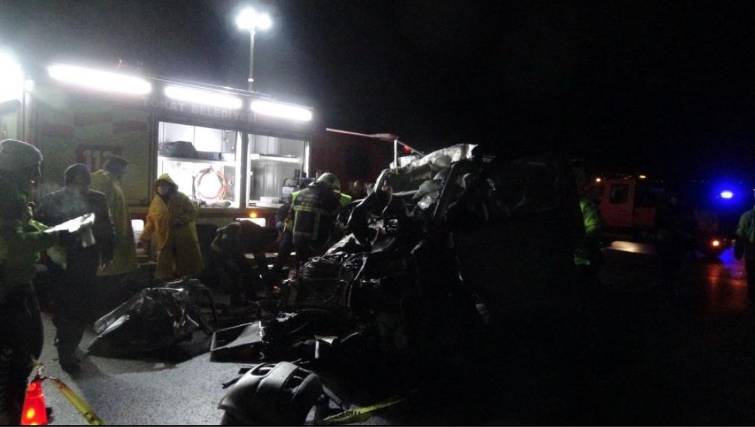 Edinilen bilgilere göre kaza, Tokat-Sivas karayolu Yatmış köyü mevkiinde çift taraflı olarak meydana geldi. Sivas istikametinden Tokat istikametine giden sürücüsünün ismi öğrenilemeyen 58 AAE 502 plakalı Volkswagen marka minibüs, aynı istikamette seyir halindeki sürücüsünün ismi öğrenilemeyen 58 TC 344 plakalı kamyona arkadan çarptı. Çarpışma sonucunda minibüste bulunan 5 kişi olay yerinde hayatını kaybetti. Çevrede bulunan vatandaşların ihbarı üzerine olay yerine 112 sağlık, itfaiye ve jandarma ekipleri sevk edildi. Ekiplerin olayla ilgili incelemesi devam ederken kimlik tespit çalışmaları sürüyor.