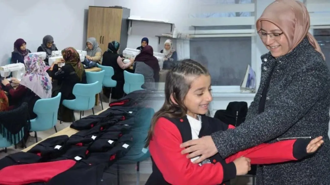 Çocukları sınıflarındayken Köy Yaşam Merkezi'nde açılan el sanatları kursuna giden anneler, öğrencilerin formalarını dikiyor. Bakanlıkça hayata geçirilen proje ile öğrencilerle veliler aynı çatı altında eğitim alıyor.