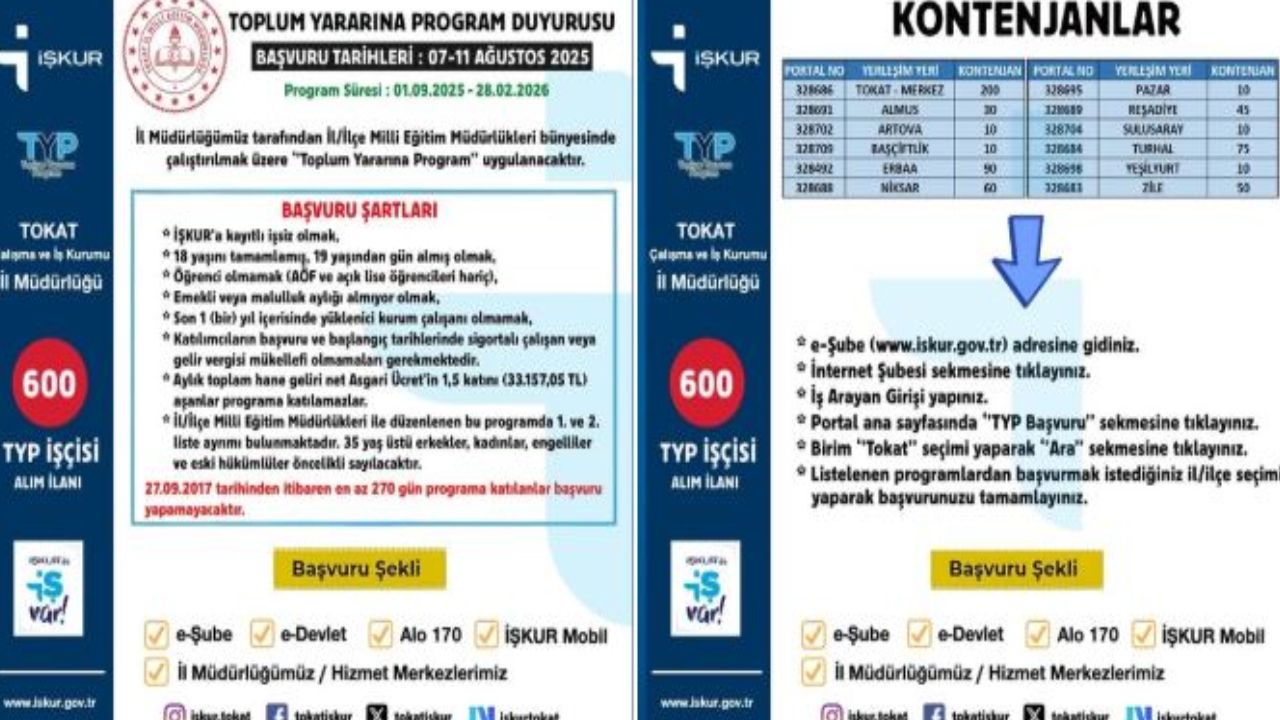 Tokat İŞKUR İl Müdürlüğü, "Toplum Yararına Program (TYP)" kapsamında yeni bir istihdam projesi başlatıyor. Programa başvurular bugün (7 Ağustos 2025) başladı ve 11 Ağustos 2025 saat 23:59:59'a kadar devam edecek.