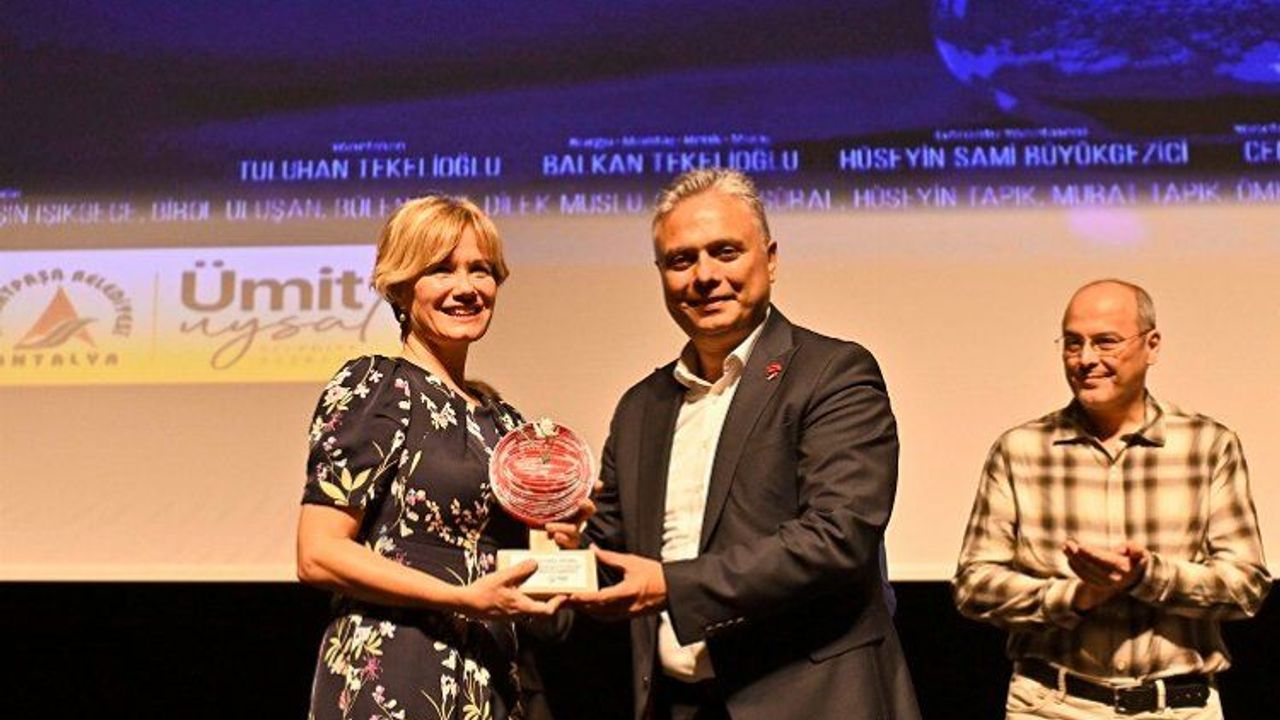 Gecenin sonunda Başkan Uysal, bu yıl çalıştayın sembolü olan koruma altındaki kum zambağının geri dönüşüm malzemeleri kullanılarak yapılan plaketini Tekelioğlu’na takdim etti.