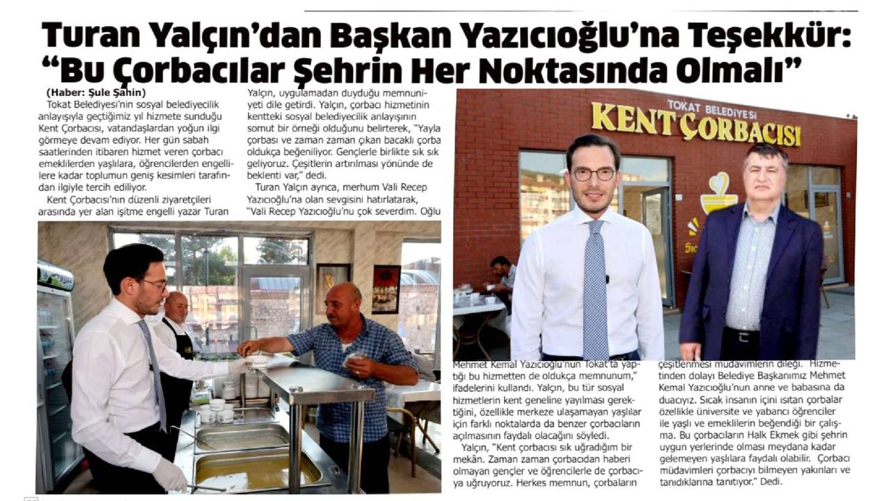 Turan Yalçın ayrıca, merhum Vali Recep Yazıcıoğlu'na olan sevgisini hatırlatarak, “Vali Recep Yazıcıoğlu’nu çok severdim. Oğlu Mehmet Kemal Yazıcıoğlu’nun Tokat’ta yaptığı bu hizmetten de oldukça memnunum,” ifadelerini kullandı. Yalçın, bu tür sosyal hizmetlerin kent geneline yayılması gerektiğini, özellikle merkeze ulaşamayan yaşlılar için farklı noktalarda da benzer çorbacıların açılmasının faydalı olacağını söyledi.