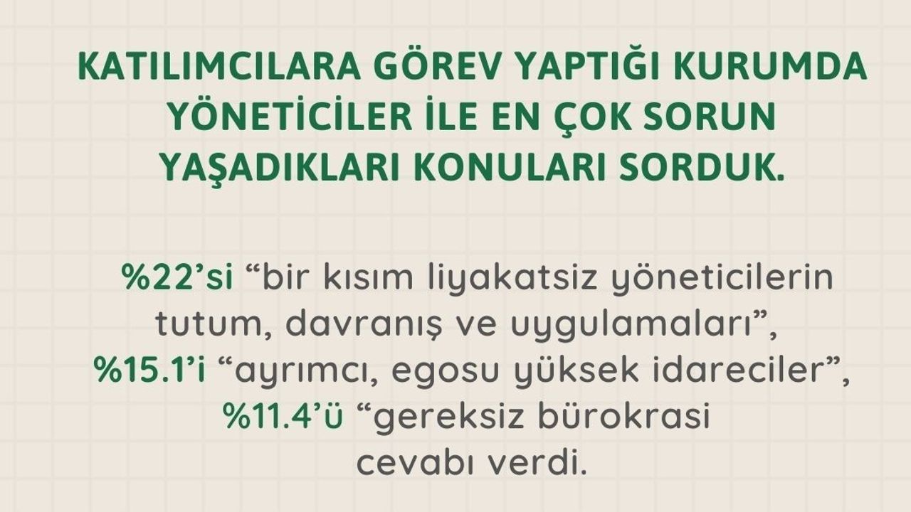 Katılımcılara kurumunda yöneticiler ile en çok sorun yaşadıkları konuları da sorduk. Buna göre yüzde 22,8’i kurumunda yöneticileri ile sorun yaşamadığını ifade ederken; yüzde 22’si ‘bir kısım liyakatsiz yöneticilerin tutum, davranış ve uygulamaları’, yüzde 15.1’i ‘ayrımcı, egosu yüksek idareciler’, yüzde 11.4’ü ‘gereksiz bürokrasi’, yüzde 8,3’ü ‘çalışanlarla iletişimsizlik’, yüzde 7,7’si ise "alandan kopuk alınan, uygulama yapılamaz kararlar’ cevabını vermiştir. Görev yaptığı kurumda iş yükünün görece az olması gerekçesiyle yöneticilerim tarafından başka birime görevlendirme vb. şekilde tehdit edilirim’ ifadesine katılıyor musunuz? sorusuna katılımcıların yüzde 79,8’i hiçbir zaman cevabı vermiştir. Bazen tehdit edildiğini ifade edenlerin oranı yüzde 7,6, ara sıra diyenlerin oranı yüzde 5,4, genellikle cevabı verenlerin oranı yüzde 2,9, her zaman seçeneğini işaretleyenlerin oranı yüzde 4,3’tür.