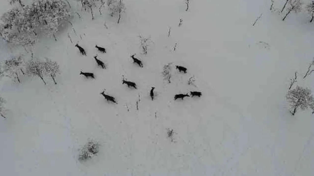 Çorum'da Türkiye'nin ilk doğal fauna tanıtım alanında bulunan yaban hayvanlarının olumsuz hava şartlarından etkilenmemesi için seferber olundu. Soğuktan etkilenmemeleri için beslenen karla kaplı tabiat parkındaki geyikler havadan görüntülendi.