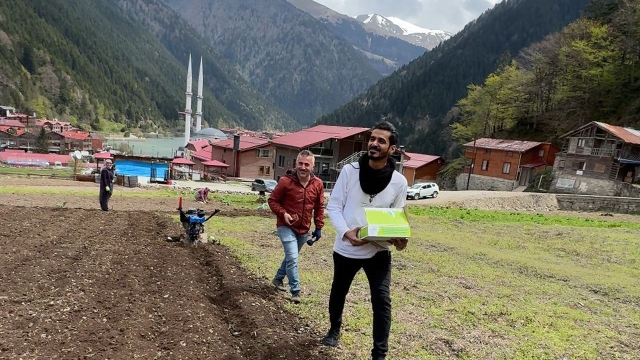 Trabzon’un dünyaca ünlü turizm merkezi Uzungöl’ü gezmeye gelen Arap turistler tarlada mısır eken vatandaşlara hurma dağıttı, tarla belleyerek yerel halka yardımcı oldu.