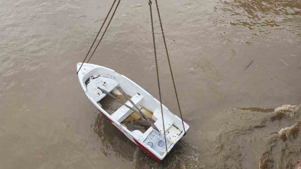 Amasya'da debisi yükselen Yeşilırmak Nehri'nde köprü ayağına takılan kayık vinç yardımıyla çıkartıldı.