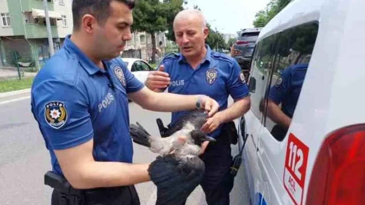 Polis kazaya sebep olan karga yavrusunu yol kenarından alarak yaralı olup olmadığını kontrol etti, daha sonra yakındaki parka götürüp ağacın dibine bıraktı.