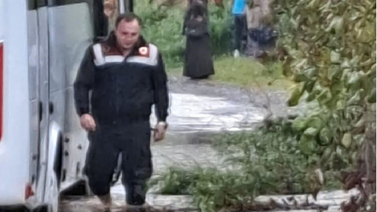 Botlarını çıkarıp suya giren bir jandarma personeli, öğrencileri güvenli bölgeye taşıdı.